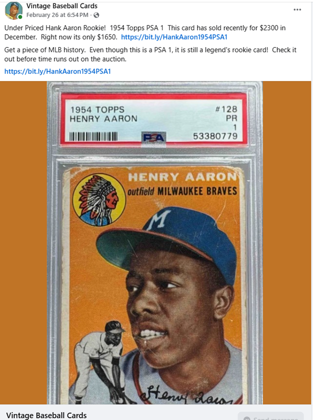 Im not sure how long I will keep the price at this amount. Sign up today for a sponsored post (https://www.facebook.com/baseballvintagecards)!